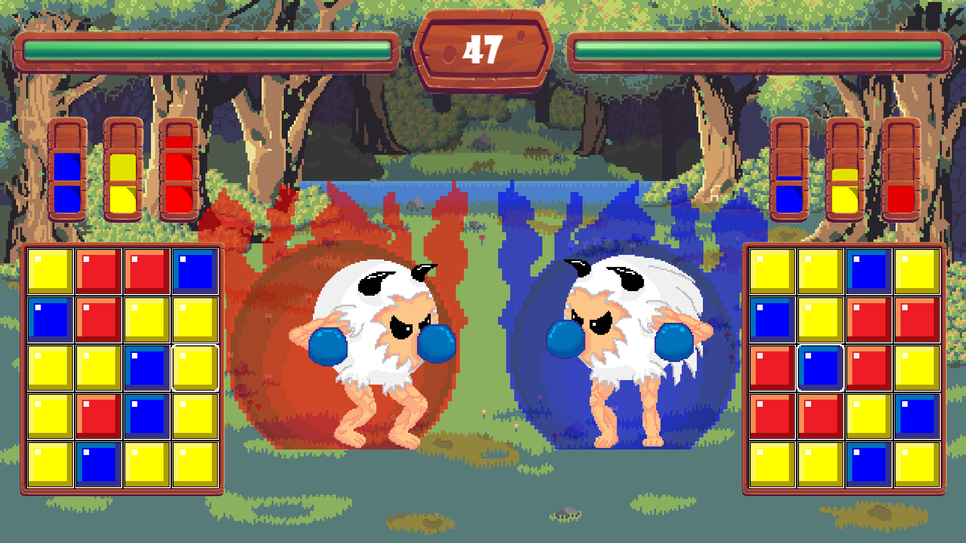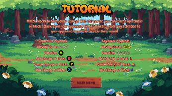 Match blocks to build attack meter. Lining up 3+ same colored blocks in a row (must be aligned by player) will cause a match. Matching will fill the attack bar of the same color. Attack the opponent until their health is at 0, or yours is greater than theirs upon Time Over.